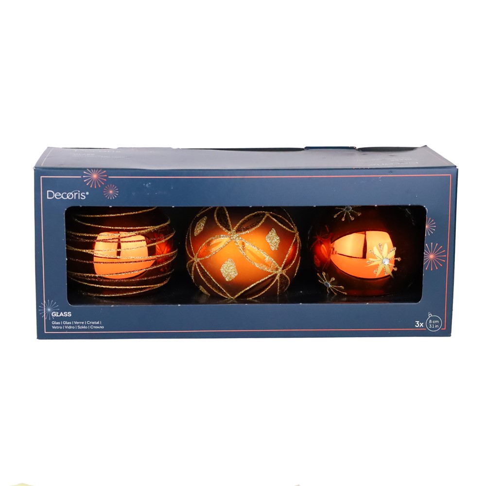 Staklene kuglice dekorirane 8cm x3kom cider narančasta/zlatna